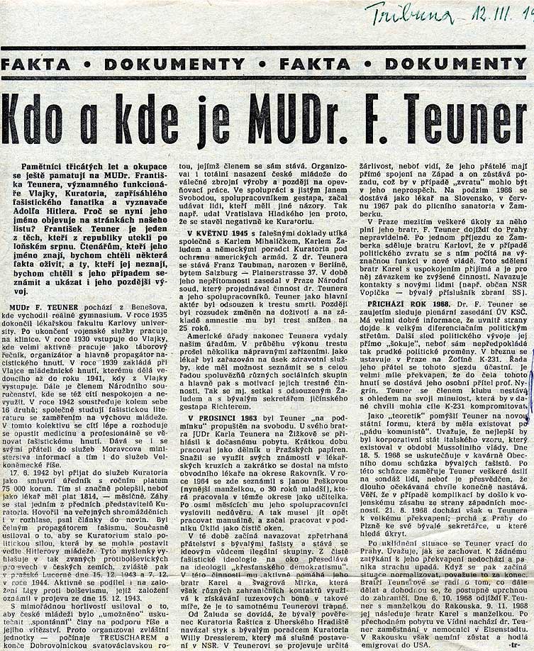 Royal: zkus ten archiv ministerstva vnitra, sice moc příjemní tam nejsou, ale materiálu tam seženeš spoustu. Jinak, když jsem psal práci o K231, tak jsem na jméno Teuner také narazil. Pohyboval se totiž kolem založení tohoto klubu a kvůli své minulosti tak poskytl munici pro komunistickou propagandu. Ještě mám doma vystřižen článek z Tribuny 12. března 1969 "Kdo a kde je MUDr. F. Teuner". Moc ti asi nepomůže, ale jestli chceš, tak ti ho pošlu. |