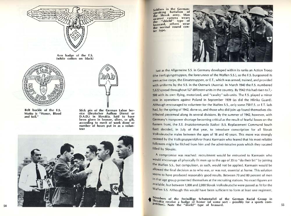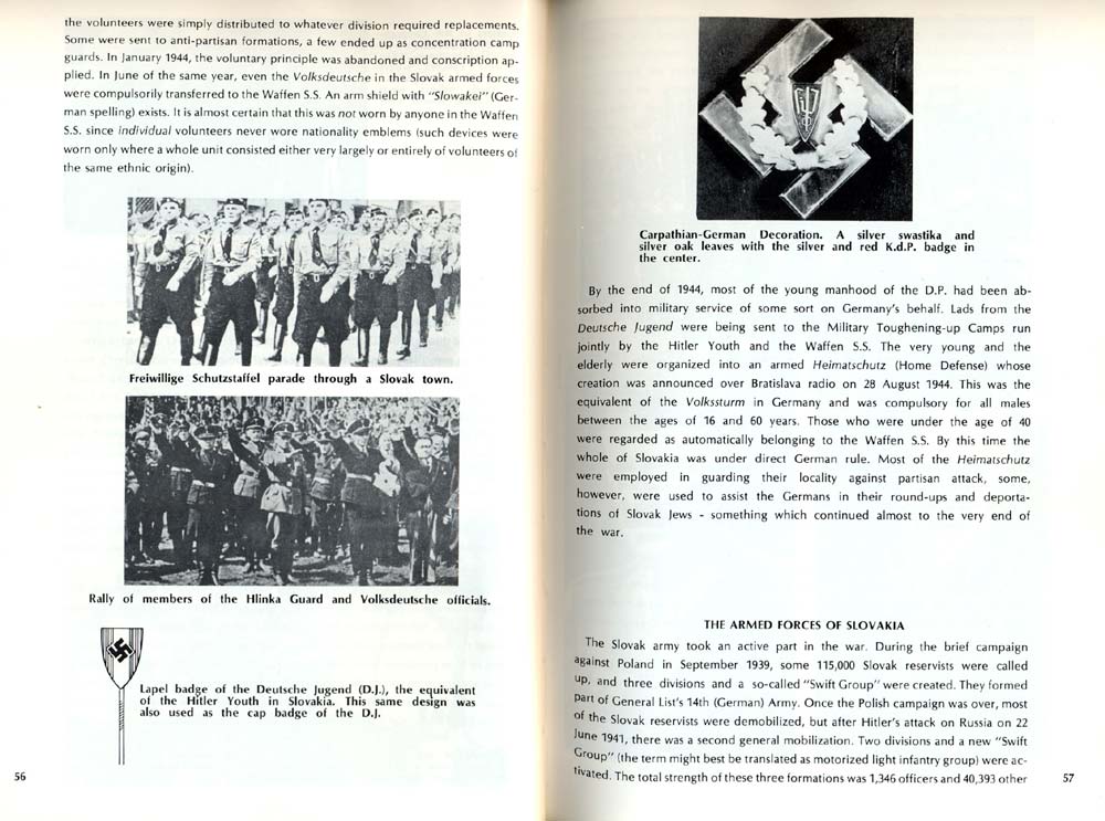 Do septembra 1944 narukovalo do W-SS 7824 muzov, WH dalsich 292, do OT a RAD 34 muzov. Do januara 1945 islo k W-SS dalsich 398 muzov. SS-Heimatschutz mal k januaru 1945 silu 8116 muzov. S nich 1591 prevelili k WH (182.div)cast k W-SS. Tolko slovenski Nemci (samozrejme aj miesanci a Slovaci hlasiaci sa k Nemcom) Co sa tyka Slovakov tak do leta 1944 ich k W-SS nastupilo len par desiatok, po vypuknuti povstania to bolo nikolko sto ludi hlavne v protipartizanskych jednotkach JG "Josef" AG-218 "Edellweis" atd. Co sa tyka jednotiek W-SS kam nastupovali ludia zo Slovenska tak islo hlavne o 7.SS div., 8.SS div, 22.SS div.a 31.SS div. Menej k 6.SS div., 10.SS div. a 2.SS div. samozrejme najst jednotlivci sa daju aj v inych jednotkach. |