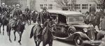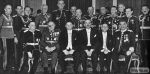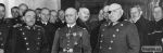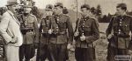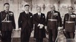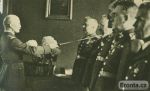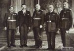 Ministr nár. obrany Machník (uprostřed v obleku) přijal 25. března 1938 odcházejícího leteckého atašé Velké Británie pplk. let. Franka Beaumonta (vlevo od něj) a jeho nástupce pplk. let. MacDonalda (vpravo od Machníka).-