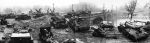 Sovětská obrněná technika, zničená a vyřazená z boje. Tanky typu IS-2, T-34/85 a samohybná děla ISU-152. Tanky T-34/85 náleží k 95. tankové brigádě 9. tankového sboru.
