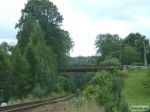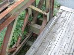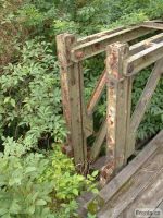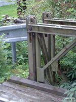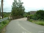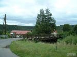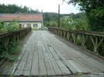 Pohled na most od jihu. Přerůstající vegetace jasně ukazuje na frekvenci dopravy. Dobře patrná je nepůvodní dřevěná mostovka.-