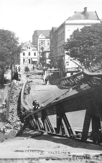Září 1939, Teschen. Zničený most přes řeku Olši (dnes Most Graniczny), spojující původně polskou a českou stranu města.