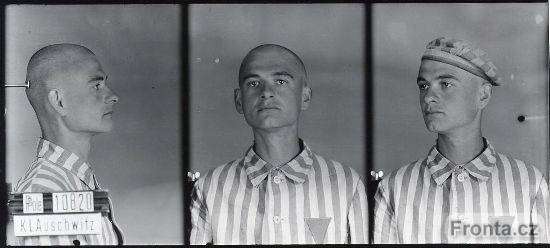 Únor 1941, Auschwitz. Fotografie Gerharda Gaury po příjezdu do koncentračního tábora. Na vězeňském obleku zatím nemá přišité číslo a označení národnosti.