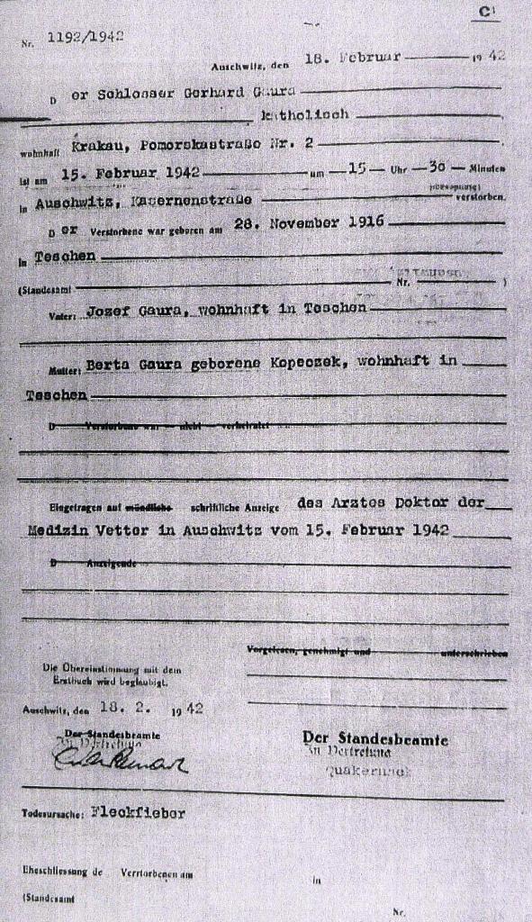 Tato snaha však vyšla naprázdno – 15. února 1942 v 15.30 Gerhard Gaura v koncentračním táboře Osvětim umírá3). Jako důvod úmrtí je v oficiální úmrtní knize (Sterbebücher)4) uveden tyfus (Fleckfieber). ČEST JEHO PAMÁTCE!