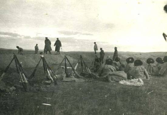 Mandžuská vojska při kopání zákopů – vojáci odpočívají, čínští dělníci kopou, důstojníci kontrolují