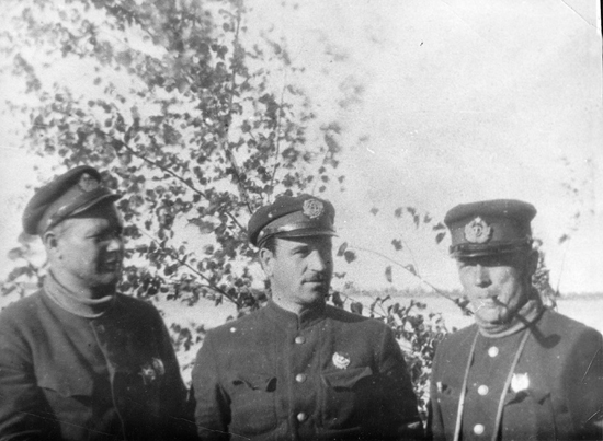 Štábní trojka 68. samostatného říčního leteckého oddílu Amurské vojenské flotily. Velitel oddílu Eduard Martynovič Lucht první zleva