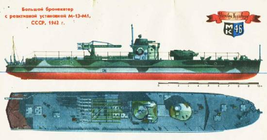 Obrněný člun BKA s raketometem M-13-M1 a věží tanku T-28