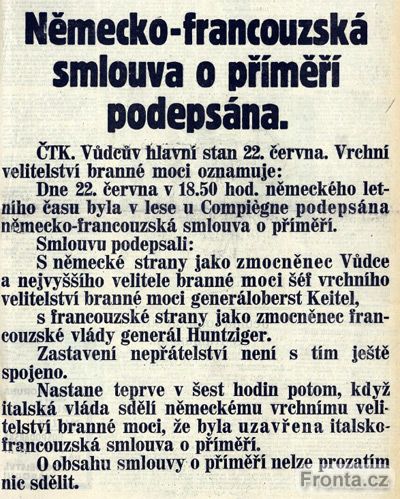 Dne 22. června 1940 v 18.50 je v lese u Compiègne podepsáno příměří mezi Francií a Německem. Hitler k tomuto účelu nechal z muzea dovézt ten samý železniční vagón, v němž císařské Německo kapitulovalo v listopadu 1918, čímž chtěl ponížit Francouze. Po podpisu dohody pak navíc nařídil zničit tamní památník první světové války, samotný vagón byl jako trofej převezen do Německa a na konci války zničen.