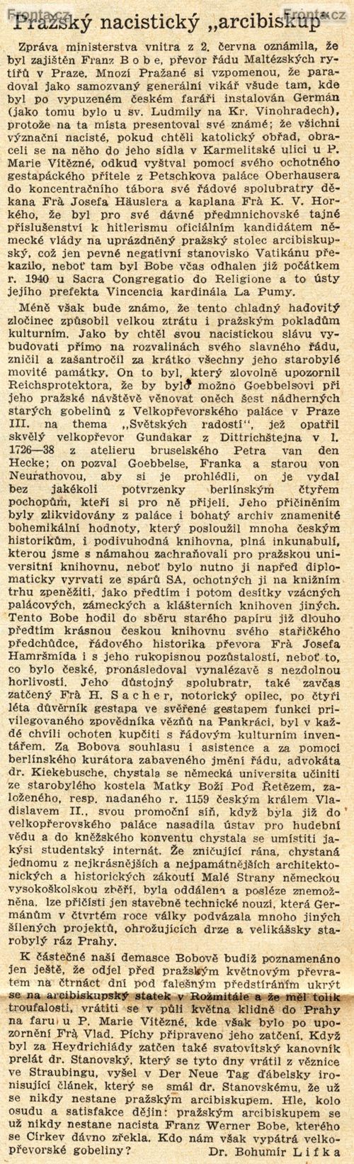 Mimořádným lidovým soudem v Praze byl 16. dubna 1947 odsouzen k trestu smrti nebezpečný konfident gestapa a SD Franz Werner Bobe. Téhož dne byl na Pankráci popraven.