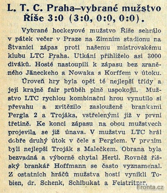 V pátek 12. ledna 1940 proběhl na Zimním stadionu na Štvanici hokejový zápas mezi mistrovským pražským klubem LTC a výběrem Německé říše. Stejně jako předchozího dne, kdy mužstvo protektorátu porazilo Říši 5:1, i tentokrát zápas skončil vítězstvím českého mužstva. Hokejový tým LTC Praha porazil výběr Říše 3:0 (3:0, 0:0, 0:0). Dvě branky vstřelil Pergl a jednu Troják. Zápasu přihlíželo 3000 diváků.
