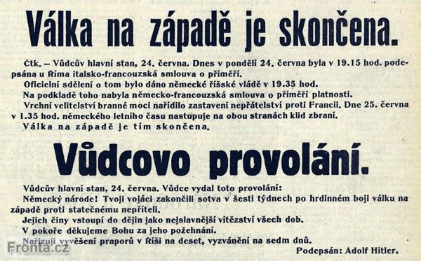 Půl hodiny po půlnoci (přesně v 0.35) vstoupila v platnost francouzská kapitulace, podepsaná 22. června v Compiègne, a bylo oficiálně ukončeno nepřátelství mezi Německem a Francií.