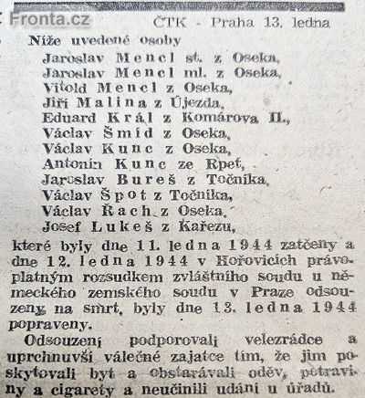 - kněz Karel Kratina byl odsouzen k smrti 6. 12. 1944 za protiněmecké výroky a vtipy
