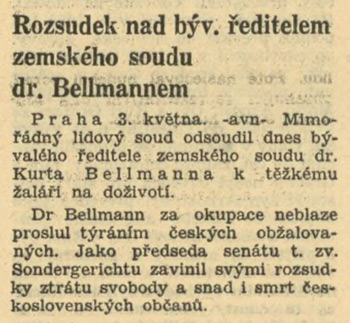 Bývalý zemský soudní ředitel (Landgerichtsdirektor) Kurt Bellmann, označovaný za „krvavého soudce z Prahy“ (Blutrichter von Prag) byl dne 3. května 1947 Mimořádným lidovým soudem v Praze odsouzen na doživotí.Kurt Bellmann se narodil 29. ledna 1901 v Kielu, na zdejší univerzitě vystudoval práva a stal se soudcem u zemského soudu v Kielu a následně v Hannoveru. Do NSDAP byl přijat dne 1. května 1933. Od 1. prosince 1941 do konce války působil v Praze jako soudce zvláštního soudu, od roku 1944 jako předseda III. komory Německého zvláštního soudu v Praze (Sondergericht). III. komora zvláštního soudu se zabývala primárně politickými případy a byla označována jako Reichsfeindekammer (soudní komora pro souzení nepřátel říše). V Praze byl Bellmannovi přidělen pětipokojový byt po deportované židovské rodině, na který si ale stěžoval, že je „málo luxusní“.