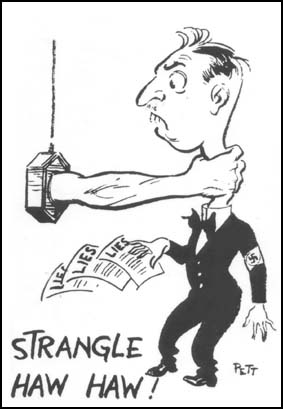 Karikatura v britském deníku Daily Mirror z června 1940 předpovídala kolaborantskému hlasateli nedobrý konec.