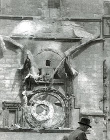 Výzdoba orloje byla zcela zničena a jeho mechanismus vážně poškozen dne 8. května 1945, během finálního útoku nacistických vojsk na Staroměstskou radnici, kde bylo jedno z center pražského povstání. Budovu radnice zapálilo německé dělostřelectvo a požár tehdy zničil mj. i dřevěnou konstrukci uvnitř radniční věže a vážně poškodil stroj orloje, který zůstal viset na pokroucených osách ciferníku.