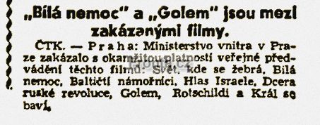 Tisková zpráva o zákazu některých filmů v pomnichovské republice.