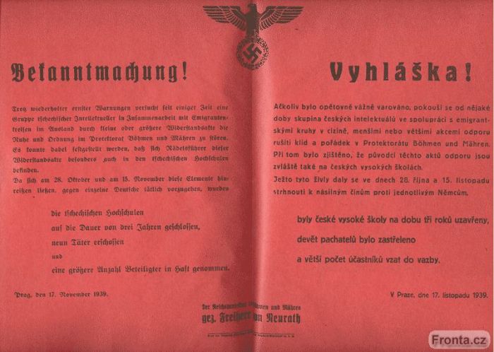 Jako odvetu za demostrace proti německé okupaci, ke kterým došlo v Praze 28. října a 15. listopadu, nacisté v noci na 17. listopadu 1939 podnikli útok na vysokoškolské koleje. Zavraždili 9 funkcionářu studentských organizací a kolem 1 200 vysokoškoláků odvlekli do koncentračních táborů. Současně byly uzavřeny české vysoké školy na tři roky (po atentátu na Heydricha bylo uzavření prodlouženo na neurčito) - viz vyhláška.