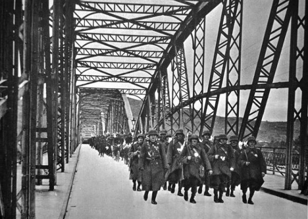 Maďarští vojáci pochodují po mostě Marie Valerie, 6. listopadu 1938. Zdroj WikiCommons, autor Ladislav Luppa.