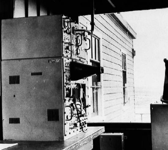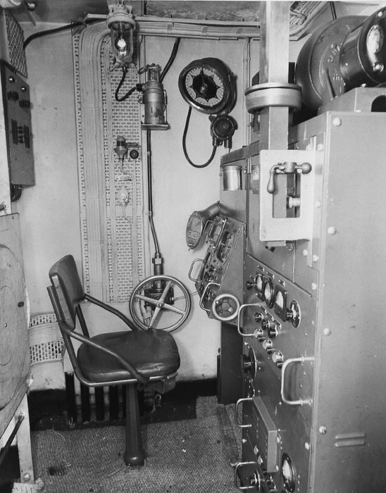 Radar SW1C na fregatě HMCS Montreal 7. února 1944. Vedle levé ruky operátora volant ze Chevroletu, vpravo od nouzové lodní lampy repetitor polohy antény