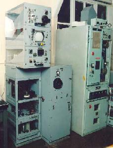 Vlevo dole detekční část, nad ní zobrazovací a vyhodnocovací část, uprostřed ovládání otáčení antény, vpravo nahoře vysílač s přijímačem, dole skříň napájecích zdrojů