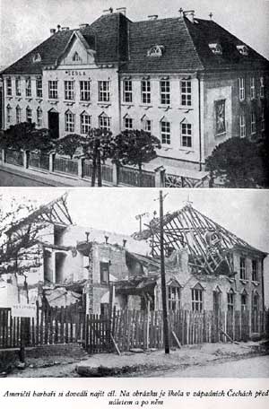 „Těsně před koncem druhé světové války provádělo letectvo USA na území naší vlasti barbarské nálety, které nemohly mít a neměly význam pro vojenskou porážku nacistického Německa a při kterých přišly o život stovky lidí, s nadějí očekávajících příchod míru. Mrtví z trosek domů na Vinohradech a Pankráci i zničená historie památných Emauz jsou volajícím vykřičníkem obžaloby amerického bombardováni Prahy na samém konci války, 14. února 1945. Krev zabitých a zmrzačených obyvatel Brna, Z1ína a Kralup je věčnou připomínkou barbarství amerického letectva.Také lid západních Čech, který prožil americkou okupaci, poznal své nepřátele již před jejich příchodem.