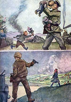 Teprve nad mrtvolkami svých dětí, zabitých americkými bombami, prohlédli. Teprve stojíce před hořícími troskami svých domů poznali, že americká letadla přinesla smrt a ničení, krev a slzy.