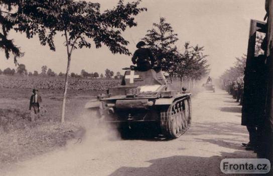 Září 1939 - Polsko. Německé tanky PzKpfw II (číslo 621) a PzKpfw I (v pozadí) míjejí stojící kolonu nákladních aut 89. Pi. Btl. / 5. Panzer Division.
