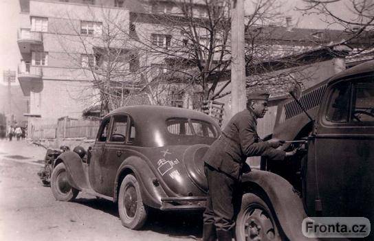 Březen 1941 – Sliven, Bulharsko. Na zadním blatníku osobního vozu je jasně čitelné označení 5. Panzer Division (žluté X) a taktické označení ženijního praporu (Pionier Bataillon) se zkratkou Kol. (Kollone). Kollone byla dopravní jednotka, která pro potřeby ženijního praporu vezla veškerý potřebný materiál (mimo pontonů), např. ostnatý drát, výbušniny, miny....