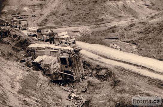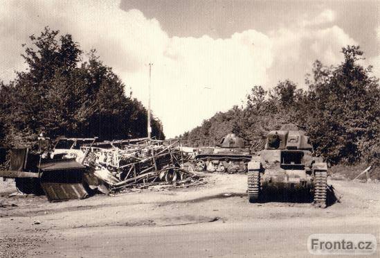 Květen 1940 - Mormalský les (východně od Jolimetz), Francie. Zničené francouzské tanky Renault R-35 pravděpodobně z 39. tankového praporu (BCC - Bataillon de Char de Combat), vlevo zbytky německého nákladního automobilu - podle tvaru předního nárazníku zřejmě typ Büssing-NAG.