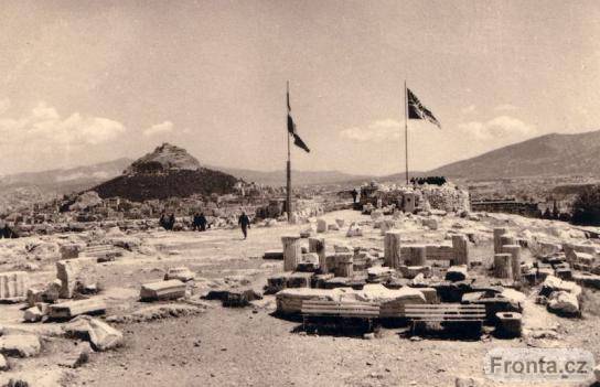 Duben 1941 - Atény, Řecko. Německá válečná vlajka nad Akropolis.