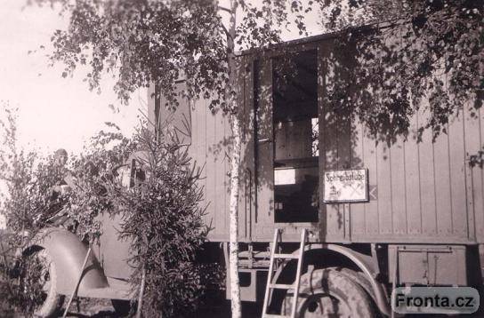 léto 1941 - Rusko. Pojízdná písárna - "pracoviště" Leopolda Stanzela. Na boku vozu je tabulka s nápisem SCHREIBSTUBE, pod ním je taktické označení jednotky (Pionier Kollone) a divize (žluté X).