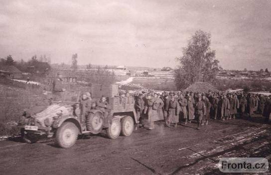 Říjen 1941 - Vjazma, Rusko. Sovětští vojáci jsou odvádění do zajetí. Vpředu jede německý automobil Kfz. 69 Krupp Protze. Na levém blatníku vozu je rozpoznatelné označení 5. PzD (žluté X) a pod ním bílé taktické označení motorizované pěchoty.