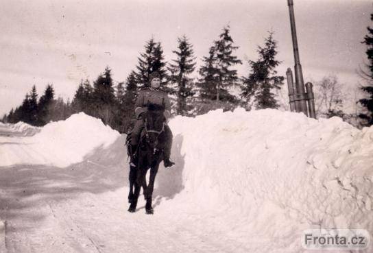 Zima 1941/42 - Semlevo (JZ od Vjazmy), Rusko. Unteroffizier Leopold Stanzel na koni - na sobě má pouze polní blůzu vz. 36 (Feldbluse M36), v jejíž knoflíkové dírce je stuha Válečného záslužného kříže II. třídy. V pozadí sovětský 85 mm protiletadlový kanón vz. 39.