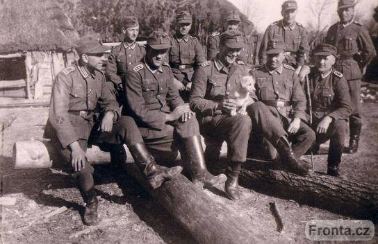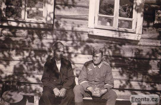 1942/43 - Rusko. Unteroffizier Leopold Stanzel v polní blůze vz. 40 (Feldbluse M40), vedle sedící civilista je zřejmě pomocníkem (Hilfswillige) u 5. Panzer Division.