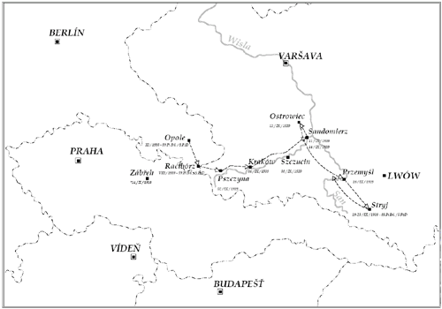 Schematická mapa bojového nasazení 5.PzD - Polsko 1939