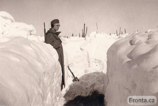 Zima 1941/42 - Semlevo (JZ od Vjazmy), Rusko. Pozice 89. Pz. Pi. Btl. / 5. Panzer Division vykopané v hlubokém sněhu. Voják má na sobě předpisový zimní plášť vz. 40 (Mantel M40) a pod lodičkou vz. 34 (Feldmütze M34) má klapky přes uši.