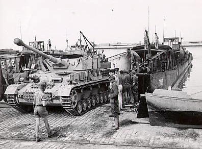 Vyloďování německého tanku Pz IV z prámu MFP na ostrově Leros- Bundesarchiv BRD