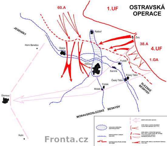 Podobně popisuje záměry a skutečný průběh ostravské operace i další účastník, tehdejší velitel 38. armády K.S. Moskalenko (Na jihozápadním směru. Praha 1976), přičemž k původnímu plánu podotýká, že „plán operace vypracovaný frontem byl nedostatečně promyšlen a v průběhu jeho plnění se nepřihlédlo ke změně situace“. Moskalenko se ve své knize také prezentuje jako autor myšlenky útoku severním směrem, kde jeho průzkum zjistil oslabenou obranu u města Żory.