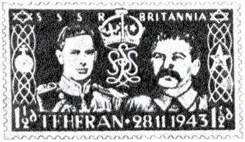 Korunu všemu nasazuje falšovaná anglická korunovační známka z roku 1937, v níž byl obraz anglické královny nahrazen obrazem Stalinovým a místo původního data uveden text: 'Teheran 28. 11. 1943.' Dále byl ve známce změněn monogram na SSSR, kterážto písmena nacházíme rovněž nad obrazem anglického krále. Nad obrazem Stalina jest naopak nápis "Britania." Kladivo bylo zamontováno do královské koruny. Sovětské symboly jsou také na obou stranách známky.