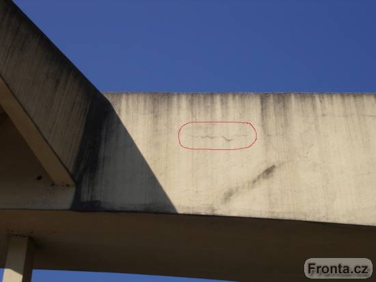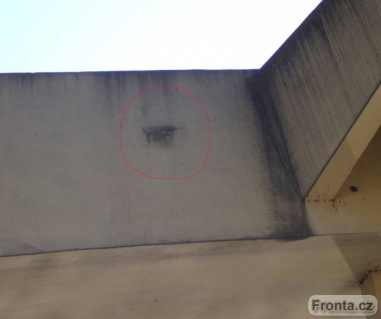 Červeně je vyznačeno jedno z pravděpodobných míst, kde byl v roce 1945 do oblouku vylámán otvor. Stopy po opravě (trhliny a nestejnorodost) jsou patrné.