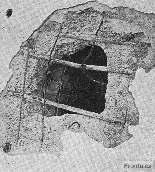 Detail vylámaného otvoru, ocelové armatury a třmínky jsou dobře patrné.