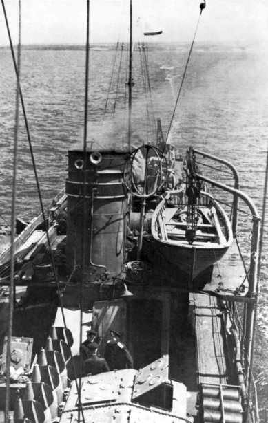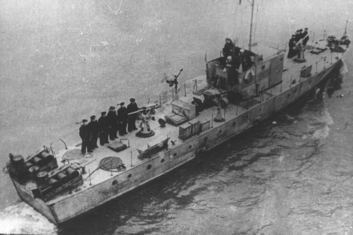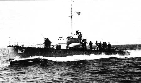 Člun typu MO-4 při přehlídce na sevastopolské rejdě těsně před vypuknutím války. Z tohoto pohledu jsou dokonale vidět dva skluzy protiponorkových pum na zádi, dva kanony ráže 45 mm na přídi a zádi i velkorážný kulomet DŠK za kormidelnou uprostřed paluby. Takto vystrojené plavidlo sloužilo většinou jako doprovod konvojů.