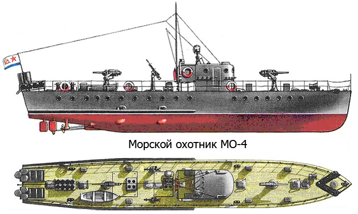 Člun typu MO-4 na kresbě. Vojenské čluny tohoto typu byly natolik univerzální, že je bylo možno využívat jako hlídkové, minolovné, protiponorkové, na svých palubách převážely i výsadky a zásoby všeho druhu a miny také někdy samy kladly. Nasazovány byly i na řekách a velkých jezerech, daly se převážet po železnici na plošinových vagonech.