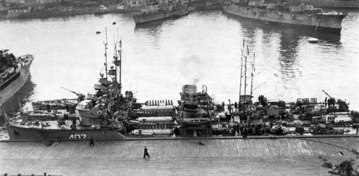 Minolovky Černomořského loďstva zakotvené roku 1941 v Sevastopolu, ležící na ještě poklidné mírové hladině. Blíže u břehu je vyvázána základnová minolovka T-407
