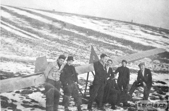 Zima 1937/38, Doubrava. Výcvik na kluzáku "SKAUT-STANDART" v rámci plachtařského odboru Masarykovy letecké ligy (MLL) v Karvinné. Rudolf Gaura druhý zleva.