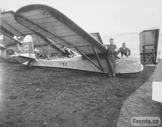 Jaro/léto 1940, Golleschau. Původní polské bezmotorové letouny, nyní již zařazené k NSFK. V popředí větroň typu "SROKA", v pozadí kluzák typu "WRONA", na jehož křídle je ještě imatrikulace původního vlastníka L.O.P.P. (Liga Obrony Powietrznej i Przeciwgazowej).