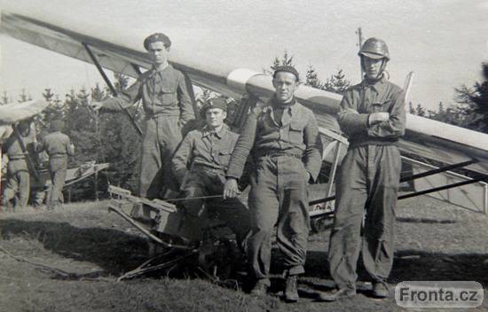 Jaro/léto 1940, Golleschau. Rudolf Gaura (druhý zprava) u původně polského kluzáku typu "WRONA".