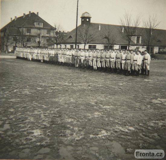 Jaro 1941, Posen. Nástup nováčků ve cvičebních uniformách (Drillichrock), v pozadí ubytovny mužstva.