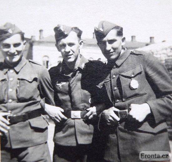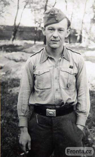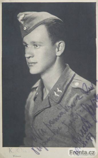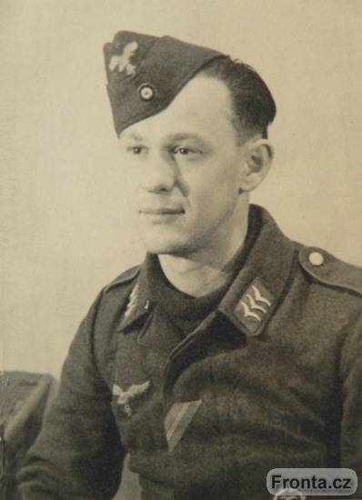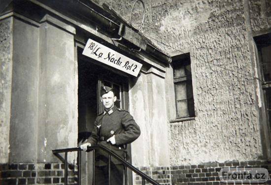 Jaro 1941, Posen. Rudolf Gaura v hodnosti Flieger před vchodem do ubytoven mužstva. Na sobě má leteckou blůzu vz. 40 (Fliegerbluse M40), na levé straně blůzy plátěnou verzi odznaku za plachtařskou zkoušku C.