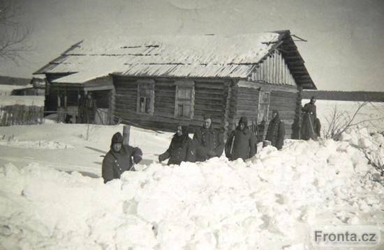 Zima 1941/42, okolí města Jarcevo (Ярцево). Budování pozic okolo vesnického domku, Rudolf Gaura první zleva.